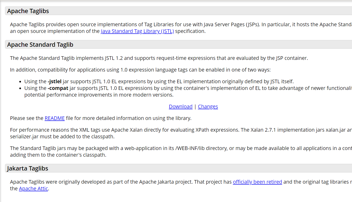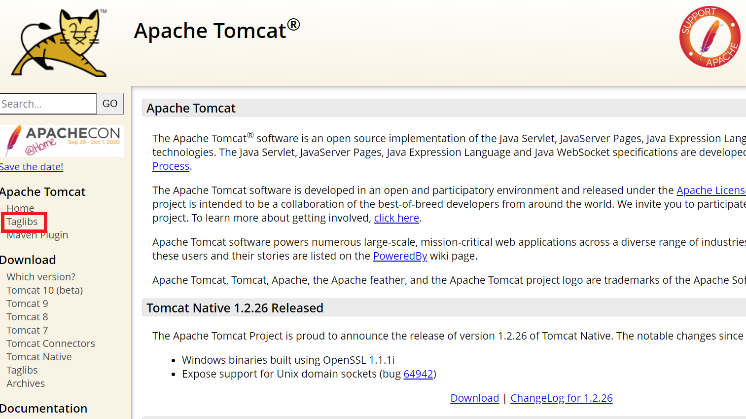 2. 왼쪽 사이드바 메뉴 Apache Tomcat - Taglibs 클릭한다.